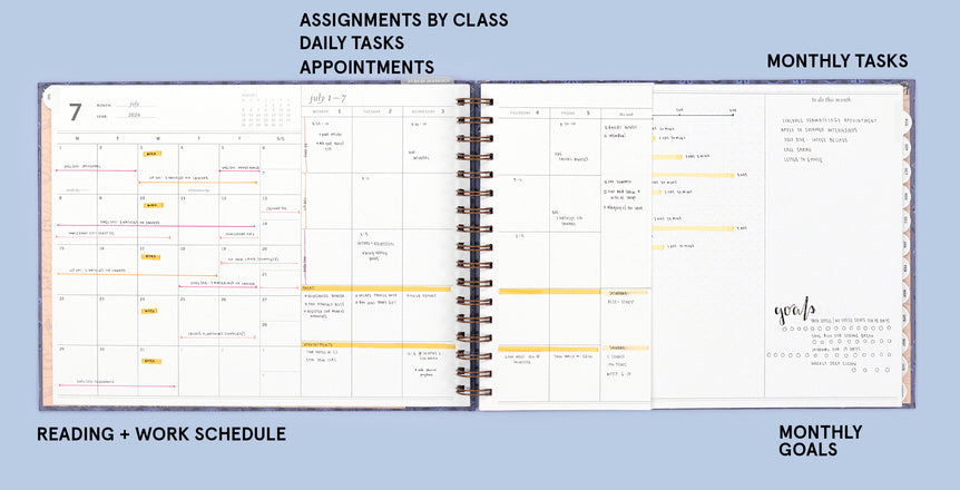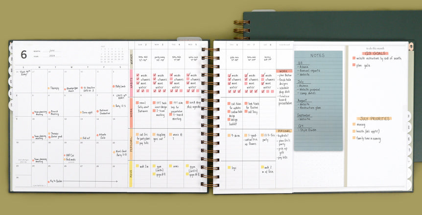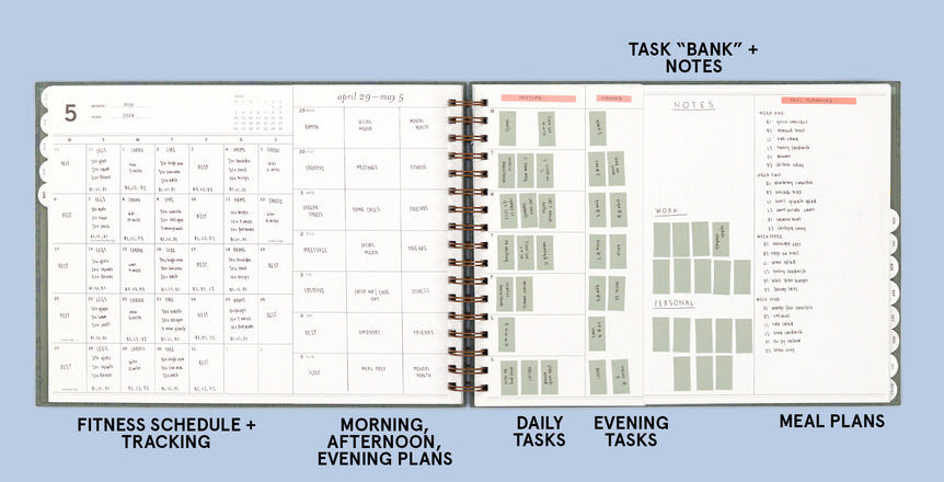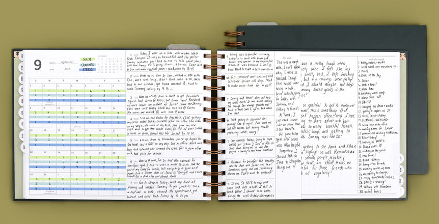 Kellen uses a digital planner for precise details of her schedule, but part of her wellness routine includes a time for daily reflection and journaling - pen to paper. Because she loves planners and all things stationery, she puts her general plans in her monthly view, uses her weekly pages for her journal, and her notes section for her end of the month reflection. This planner layout allows her to look back on her journal AND what her schedule looked like, allowing her to really reflect on her feelings and what her life was filled with at any given time.See how we use our Horizontal Weekly Planner