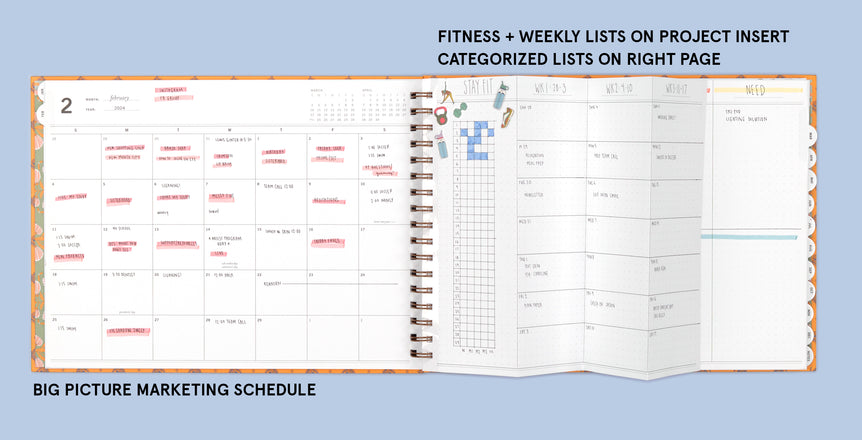 In the Project Planner, there are no daily or weekly short pages around the coil (although you can purchase inserts for that). This planner has a more open concept with a large monthly view on the left side and a space for categorized lists or brain drops on the right side. This planner also features extra project breakdown pages in the back.