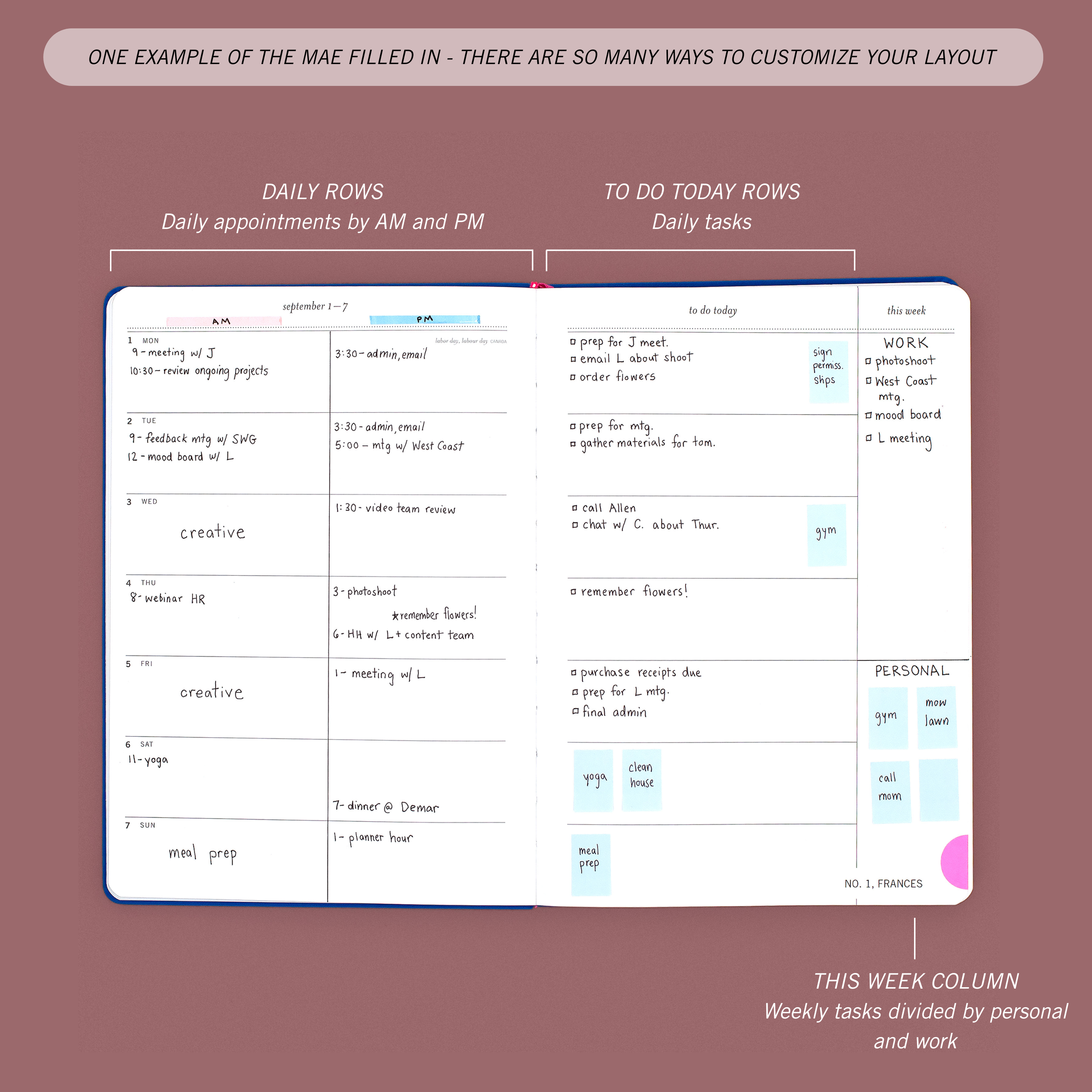For the list lovers and schedule jugglers, this streamlined version of our classic Horizontal layout gives you more room to plan the details of your week, your way. With generous space for your daily schedule on the left and to-do list space on the right, it’s the perfect blend of structure and simplicity in a portable size.