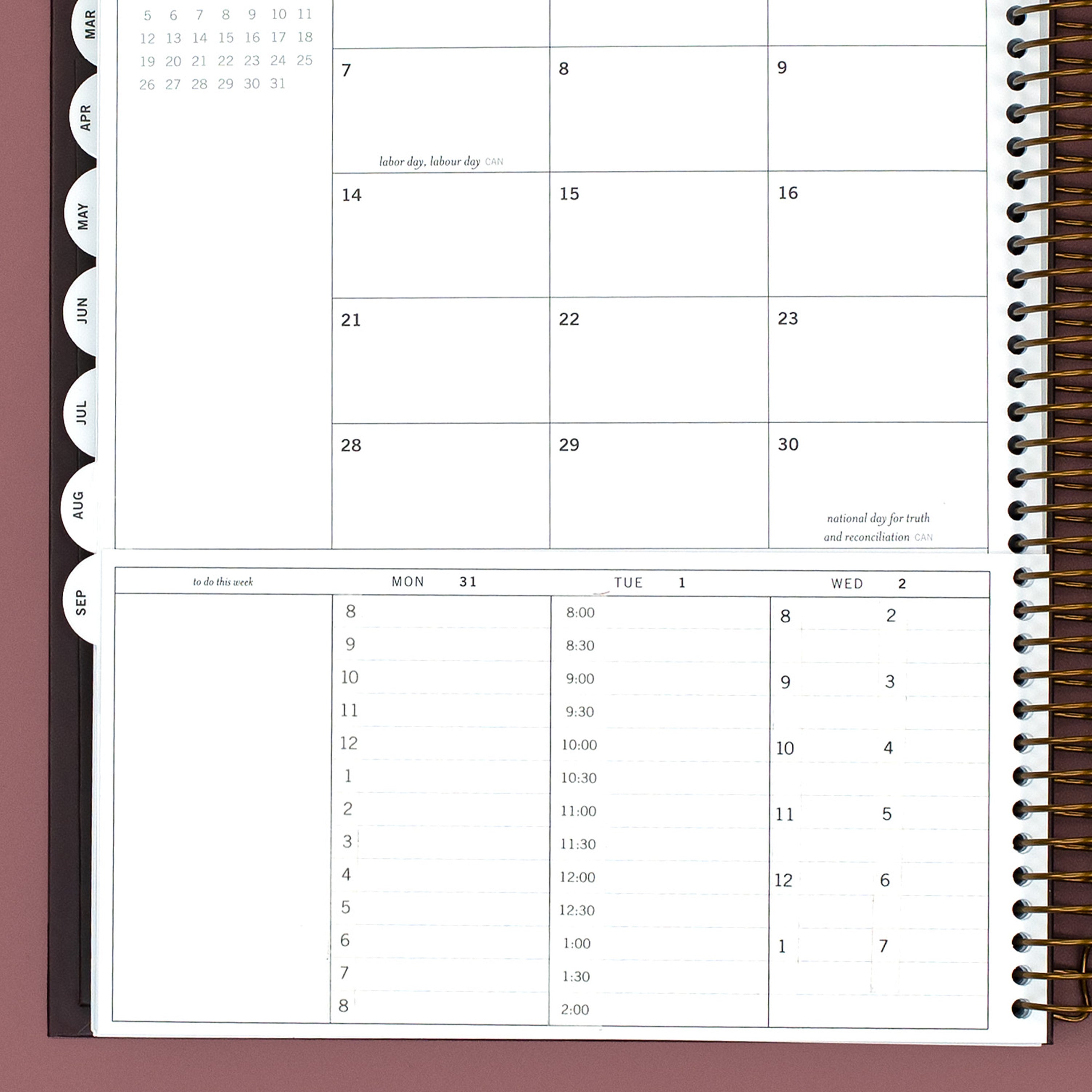 The Rose doesn’t include short daily or weekly pages around the coil (though inserts can be added!). It offers a large monthly view on the left and space for categorized lists or brain drops on the right.