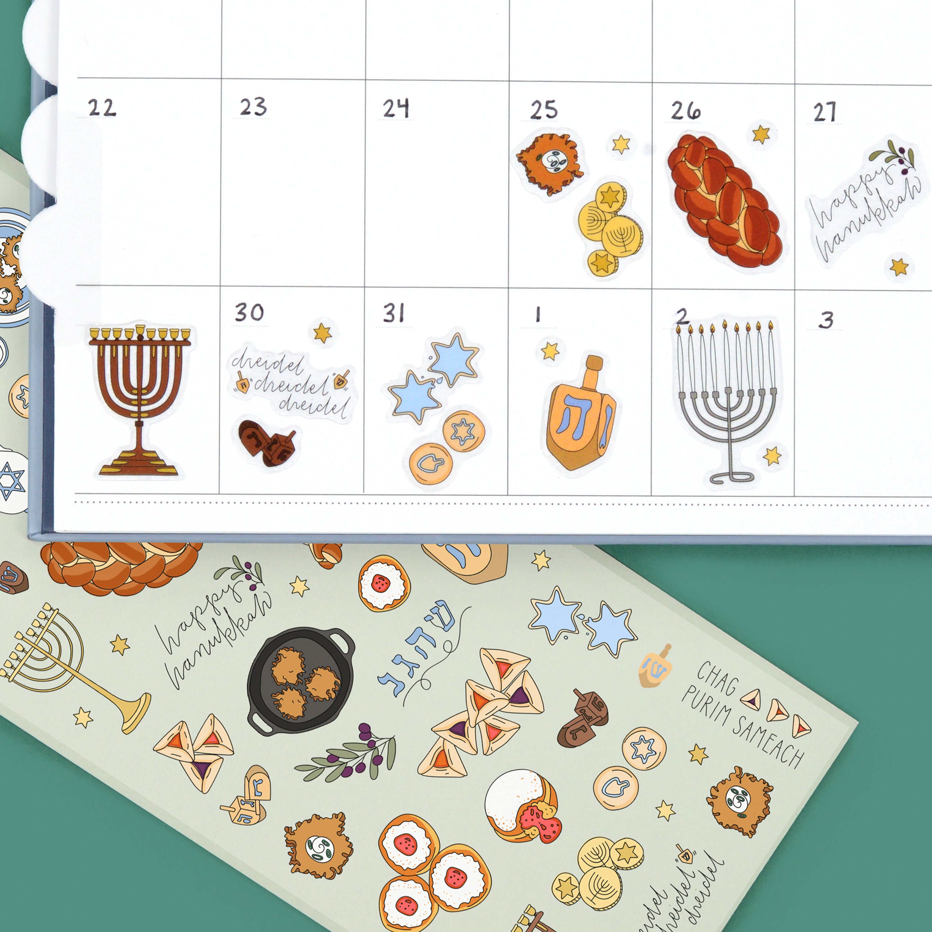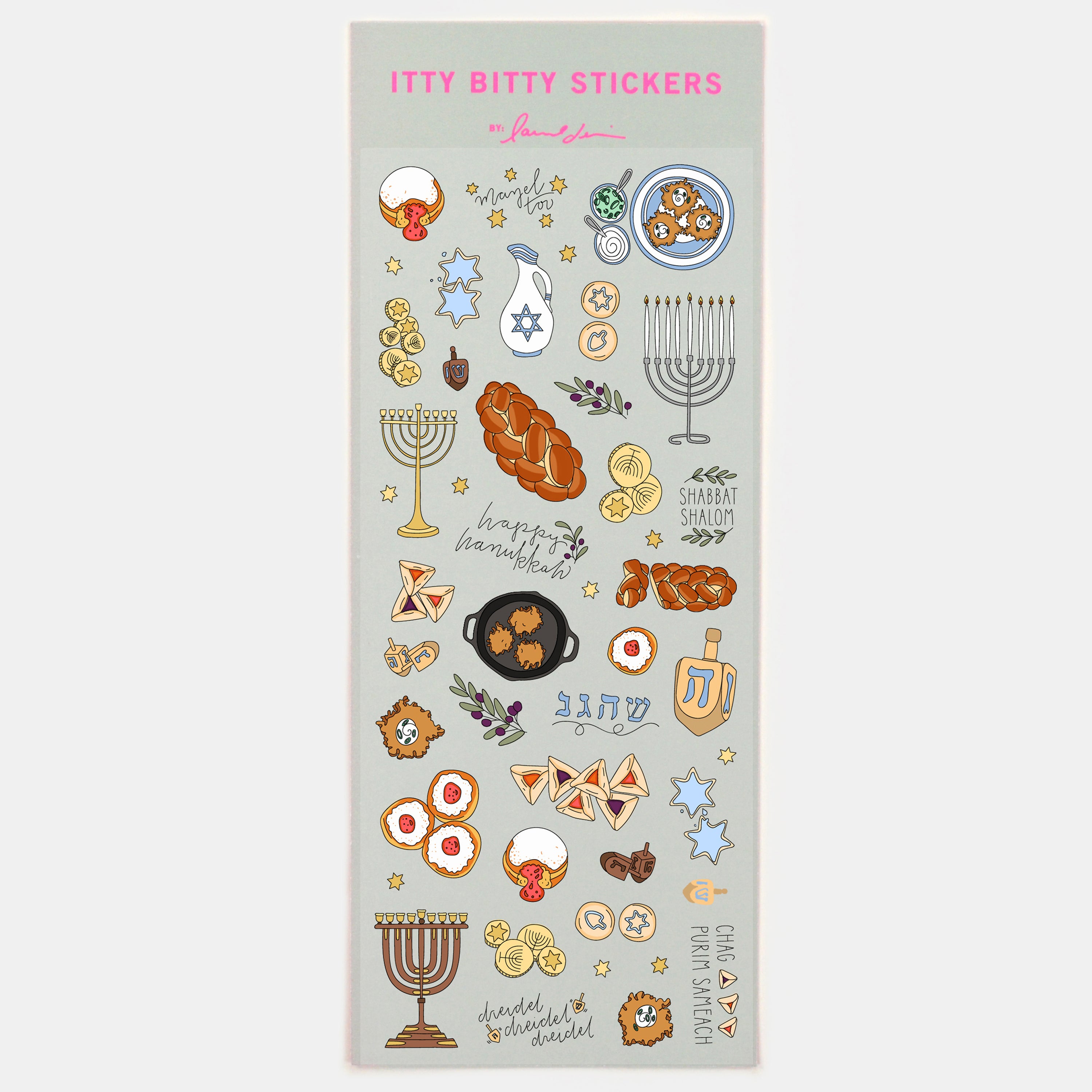 Despite our best attempts to cover multiple holidays and to spell things correctly, it's come to our attention that there are certain incorrectly featured items on these sticker sheets. We hope to expand (and correct!) this beautiful set in the coming months, so please enjoy them on sale and wait with fun anticipation with us for the new + improved Jewish Holidays Sticker set!!