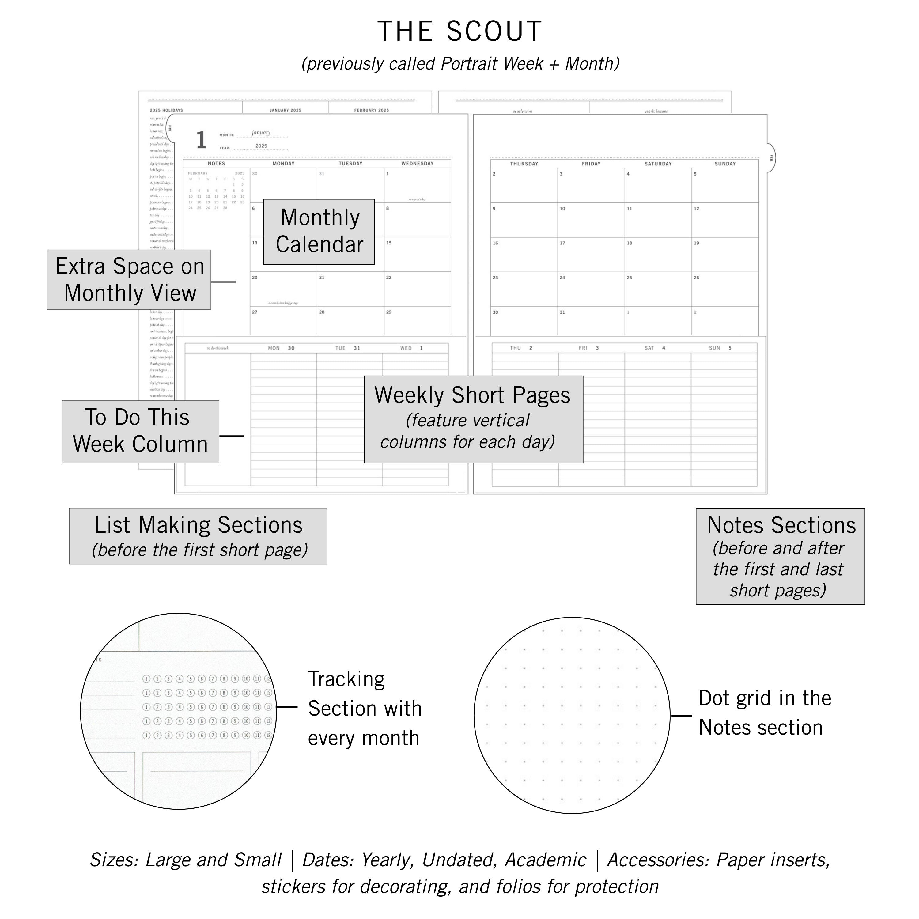 The Scout is spiral-bound, with short weekly and daily pages running along the bottom. Each day has a lined vertical column for structured planning.